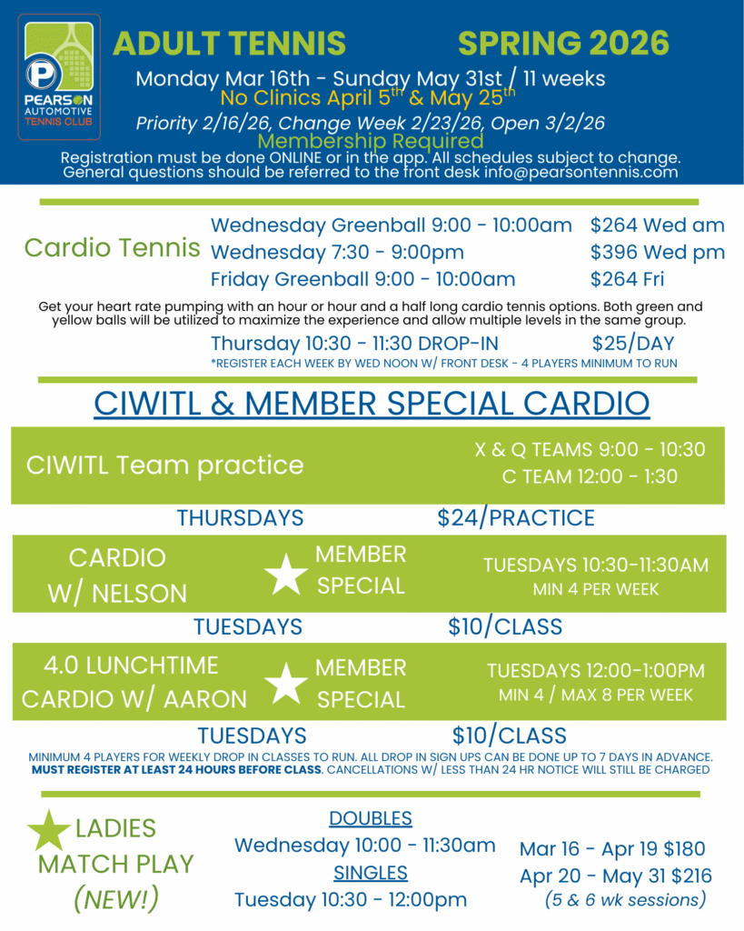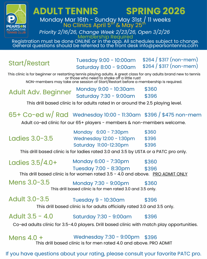 HAVE A CREDIT TO USE? – EMAIL THE FRONT DESK WITH YOUR REGISTRATION REQUEST AND WE WILL APPLY THE CREDIT FOR YOU! ANY REGISTRATION THAT CANNOT BE COMPLETED ONLINE, MUST BE SUBMITTED IN WRITING TO INFO@PEARSONTENNIS.COM