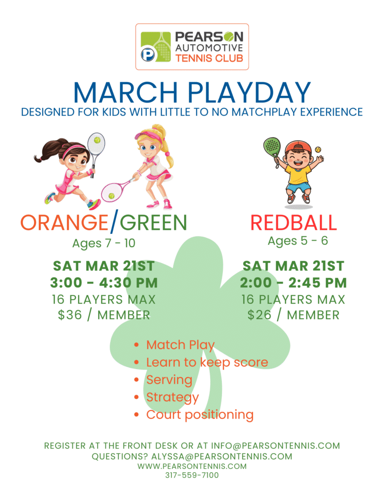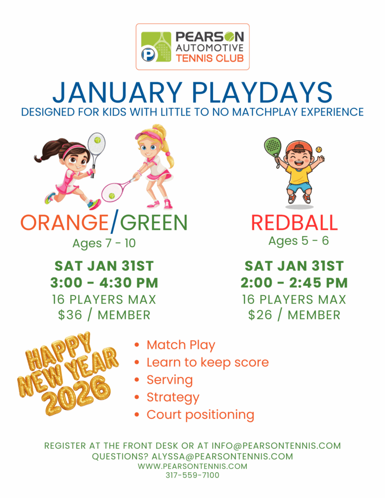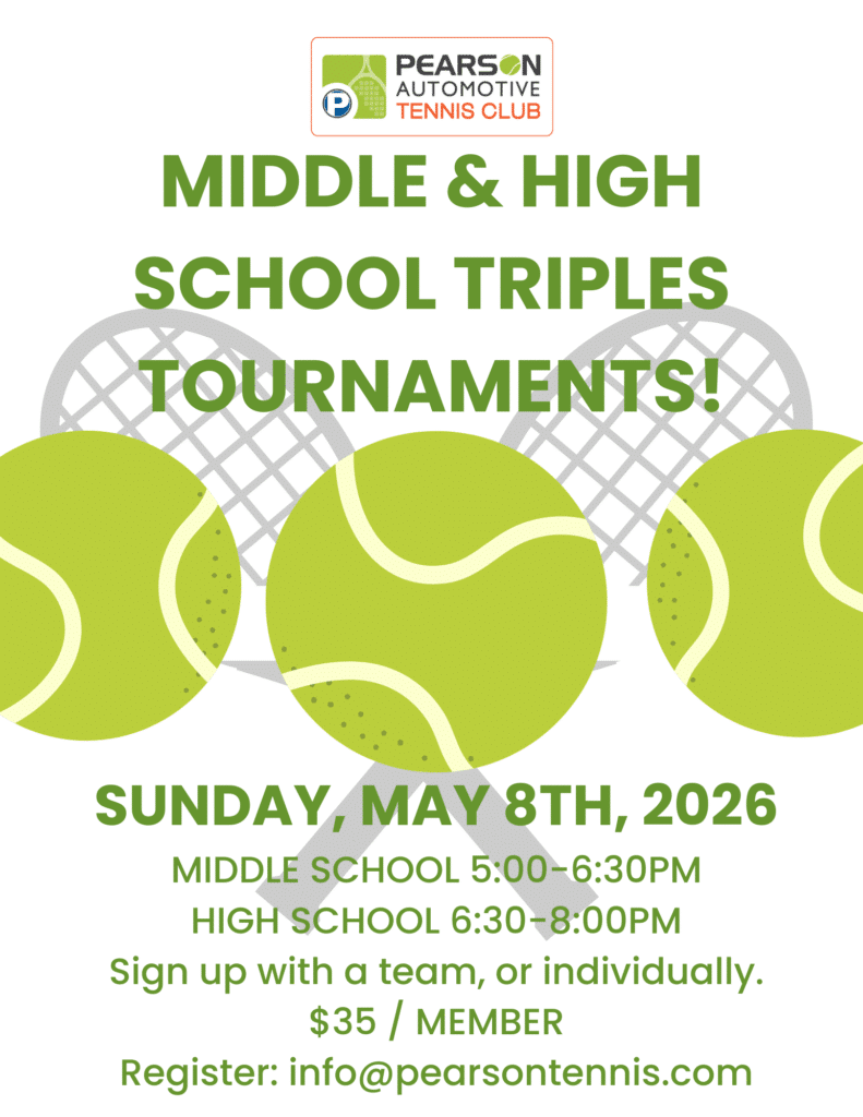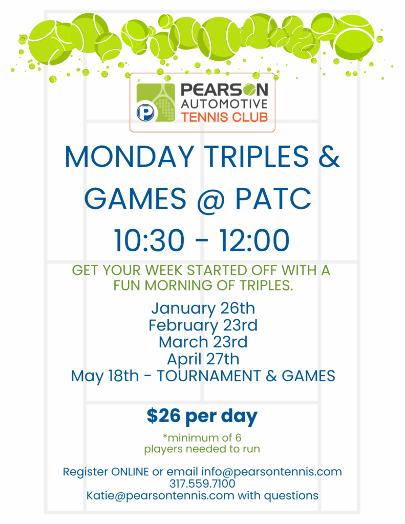 Contact the front desk with questions or to register for any events at info@pearsontennis.com or 317-559-7100Be sure to follow us on social media for updates and event information!
