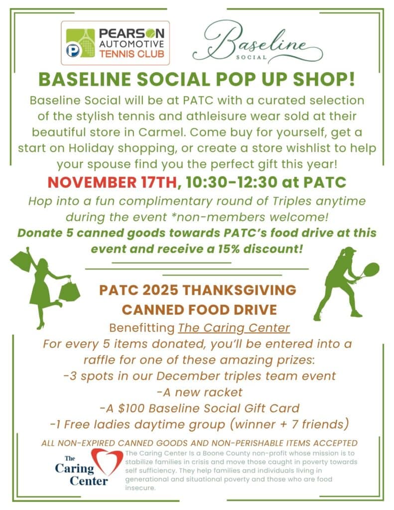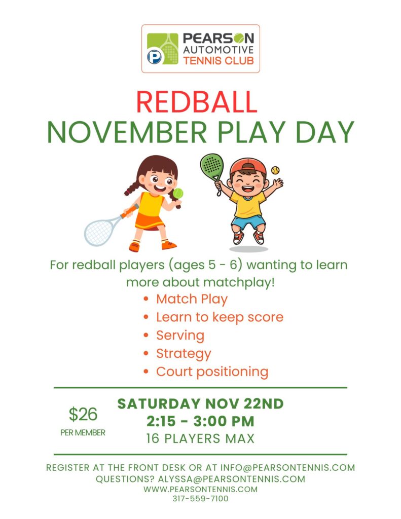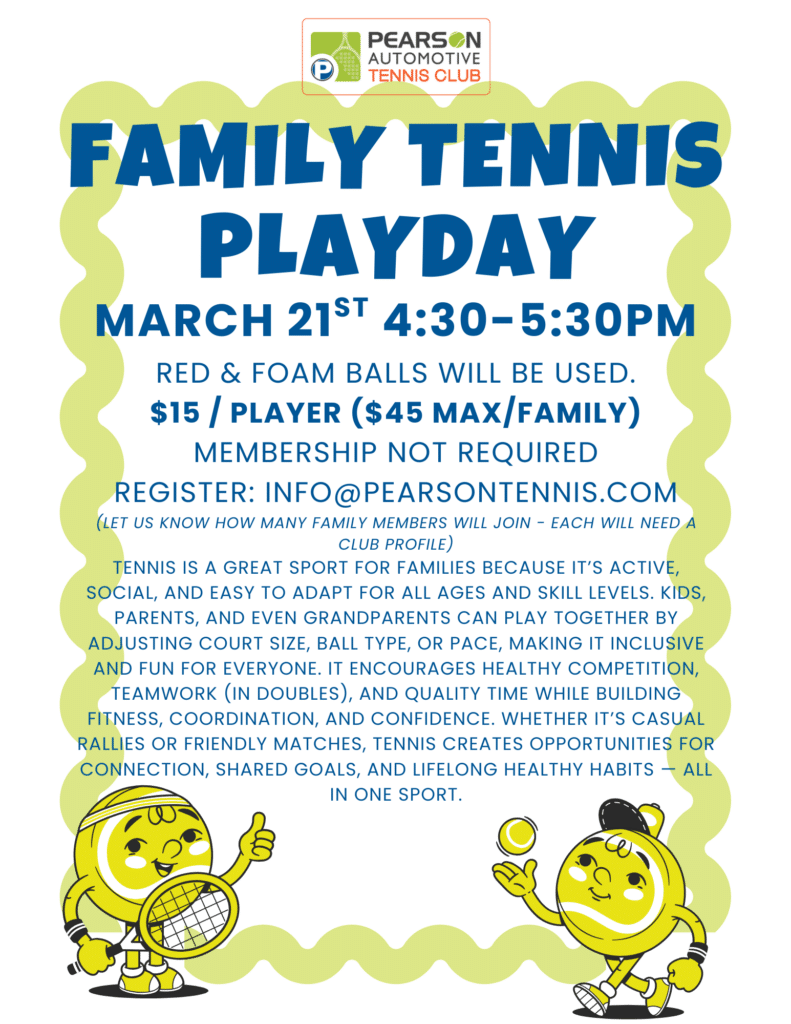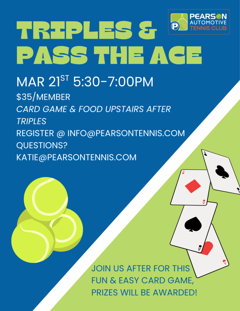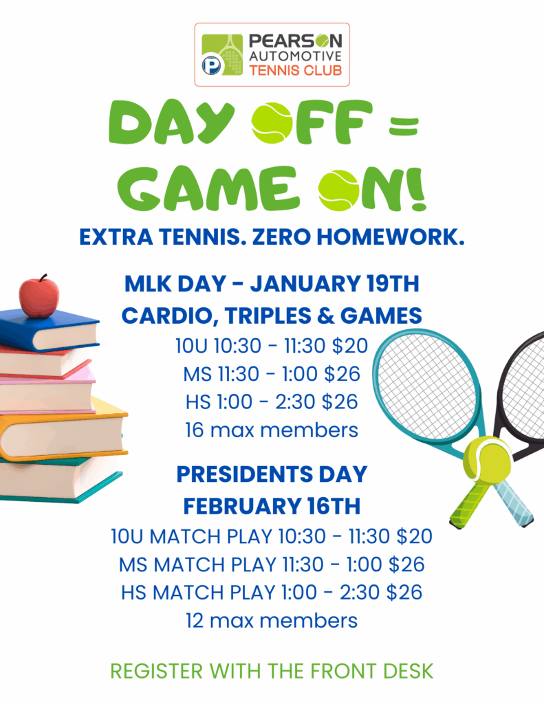 Contact the front desk with questions or to register for any events at info@pearsontennis.com or 317-559-7100Be sure to follow us on social media for updates and event information!
