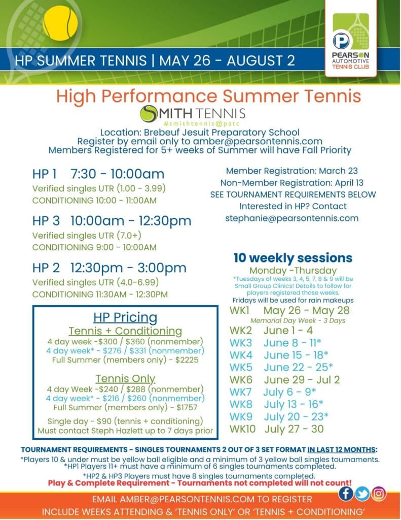 PLEASE BE SURE TO INCLUDE IN YOUR EMAIL IF YOUR PLAYER WILL DO TENNIS ONLY OR TENNIS + CONDITIONING OPTION,